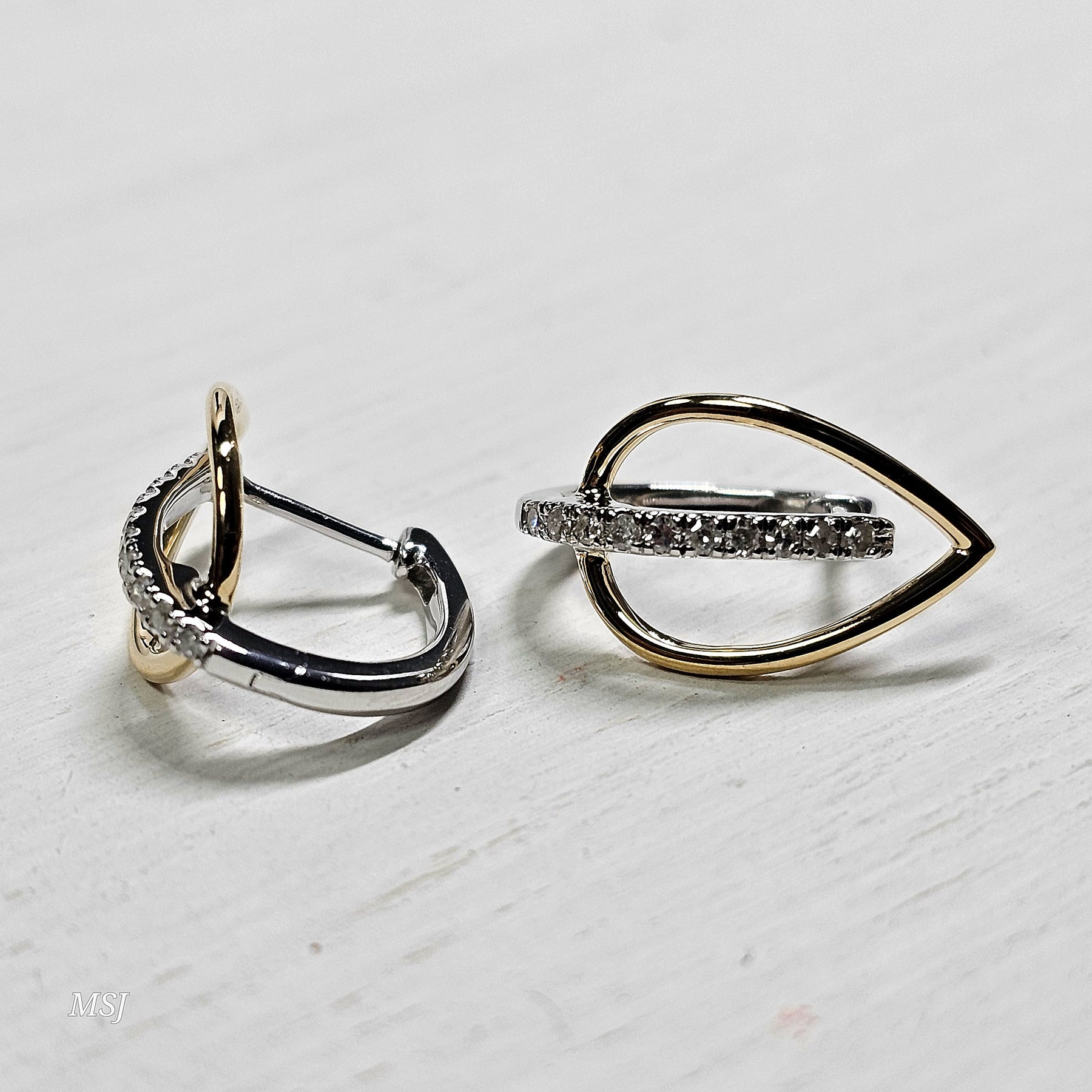 These unique huggie hoop earrings feature an eye-catching pear-shaped design crafted in white and yellow gold. The shapes face opposite directions for a modern, asymmetrical look, and are accented with .17cts of round brilliant diamonds that add a soft shimmer. The huggie style sits comfortably and securely on the ear, perfect for everyday wear or dressy occasions. Stylish, lightweight, and distinctive, these two-tone diamond hoops offer a fresh take on classic elegance.
