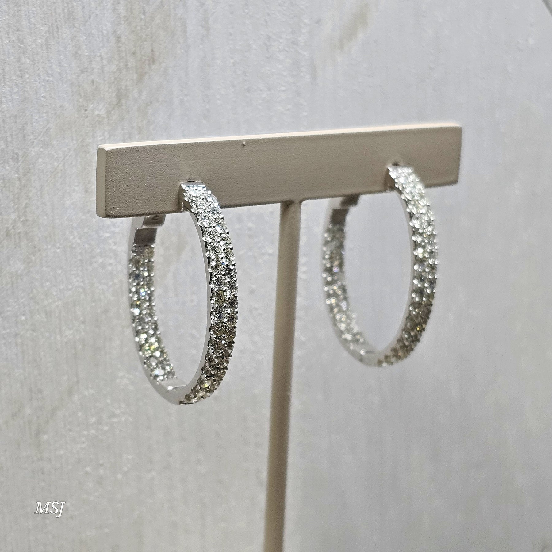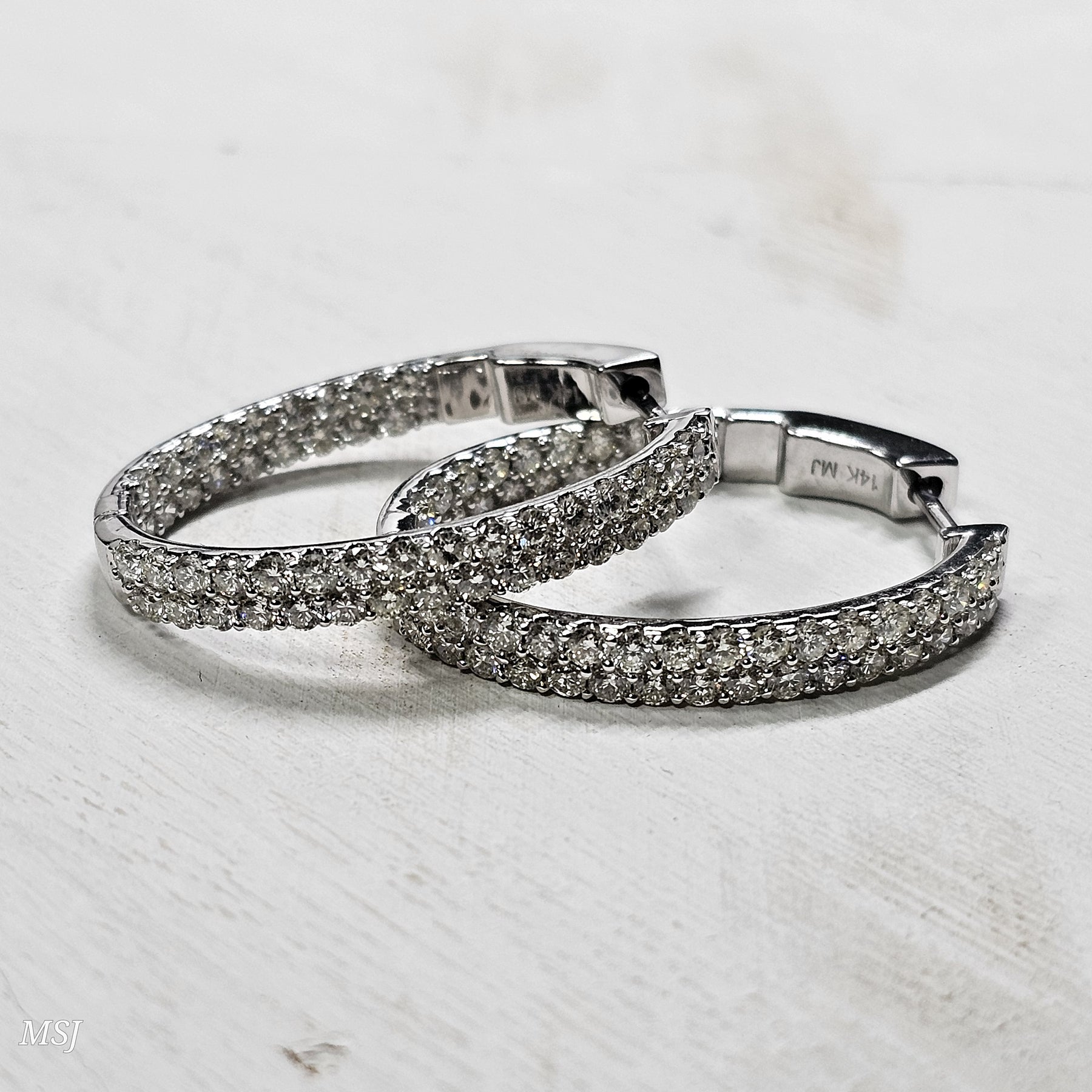 Make a bold, luxurious statement with these large inside-out diamond hoop earrings, showcasing an impressive 3.07 carats of premium round brilliant diamonds. Designed with a double row of prong-set diamonds, these hoops deliver maximum sparkle from every angle—inside, outside, and all around. Each diamond is hand-selected for exceptional brilliance, giving the earrings a radiant, high-end finish.