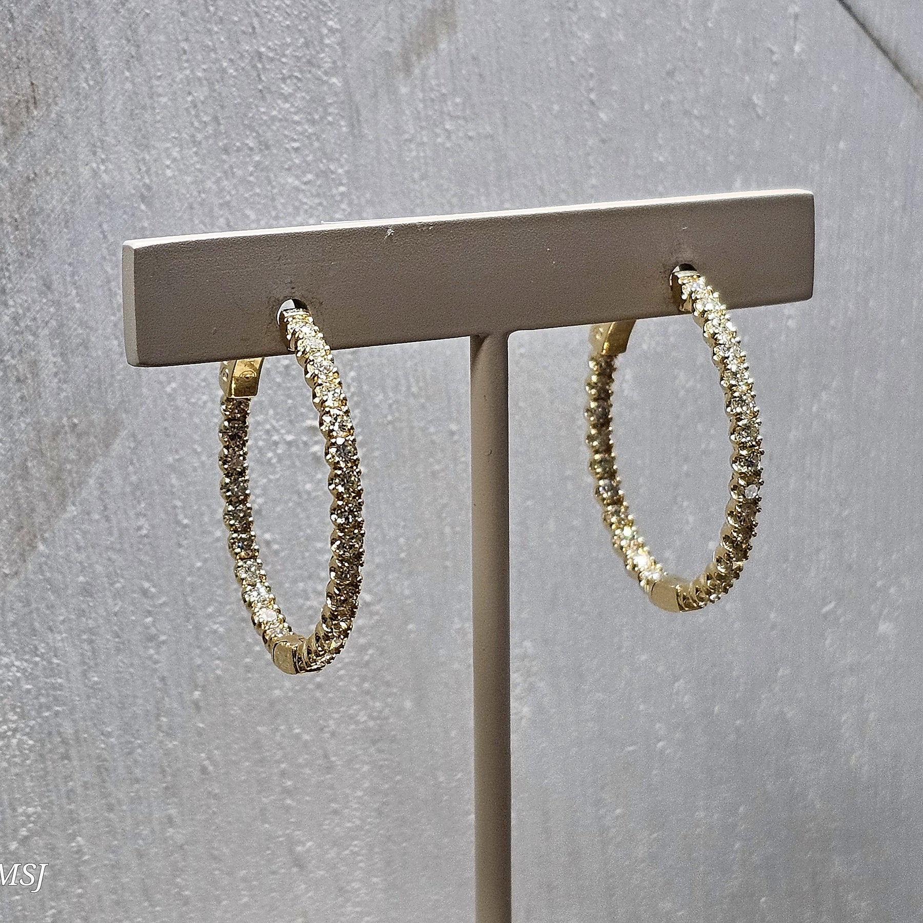 Make a bold statement with these large 14k yellow gold diamond hoop earrings featuring 2.00 carats of dazzling round diamonds. Expertly prong-set along both the outside and inside of each hoop, these earrings deliver brilliance from every angle. Sleek, sophisticated, and timeless, they are the ultimate luxury accessory for any occasion.
