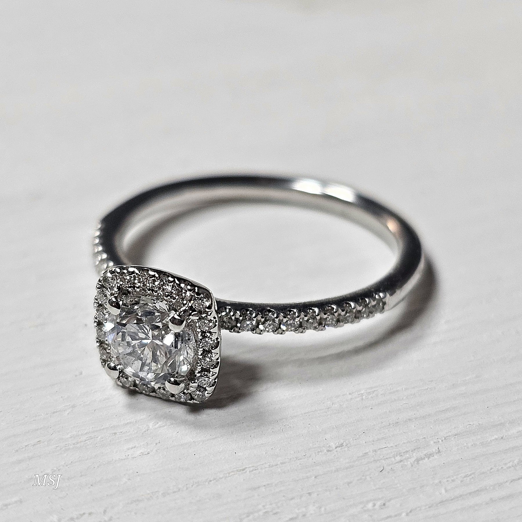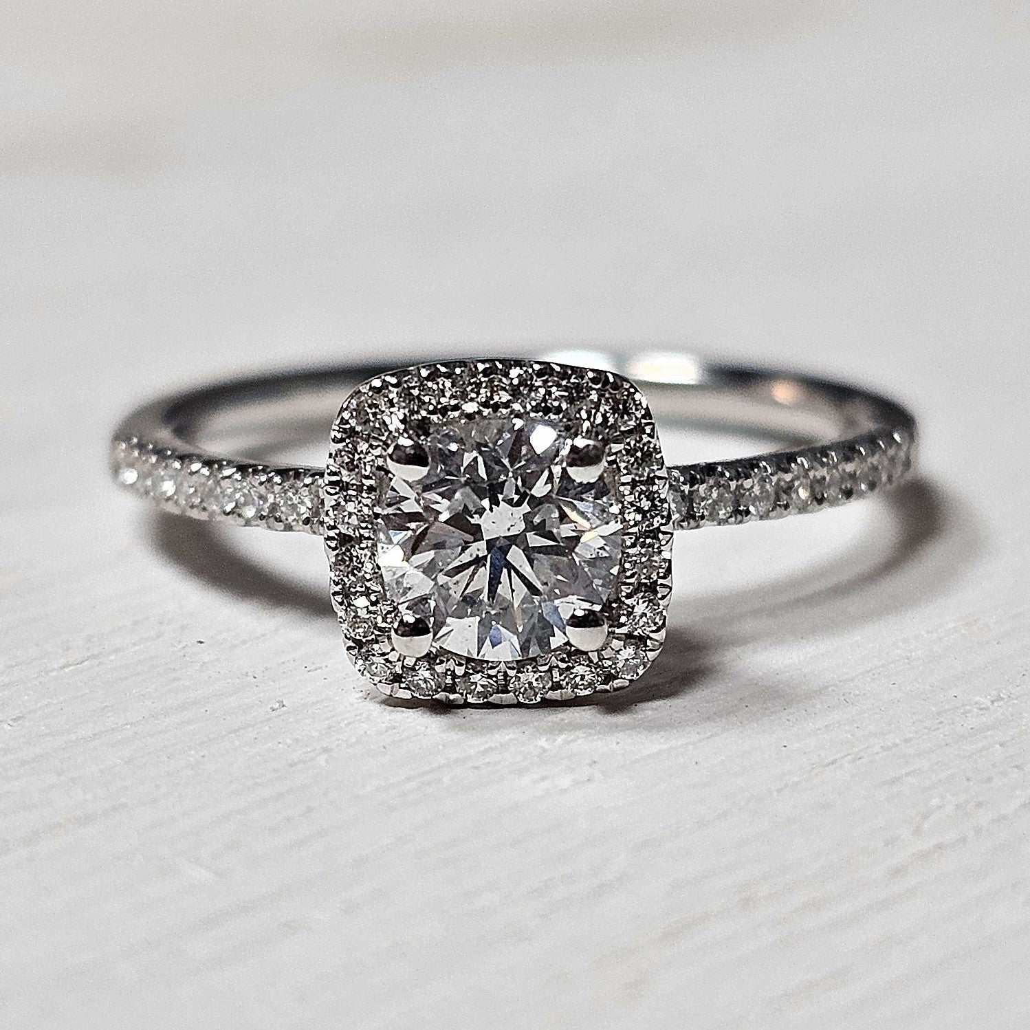 Timeless Round Natural Diamond Halo Engagement Ring in 14K White Gold Make your moment unforgettable with this classic halo-style engagement ring, finely crafted in polished 14K white gold. At the heart of the design is a stunning .72 carat round natural diamond, known for its brilliant sparkle and timeless appeal. The center stone is beautifully framed by a shimmering halo and accented band, featuring .20 carats of prong-set round natural diamonds that enhance the overall brilliance. Elegant and enduring, this ring is a perfect symbol of lasting love.