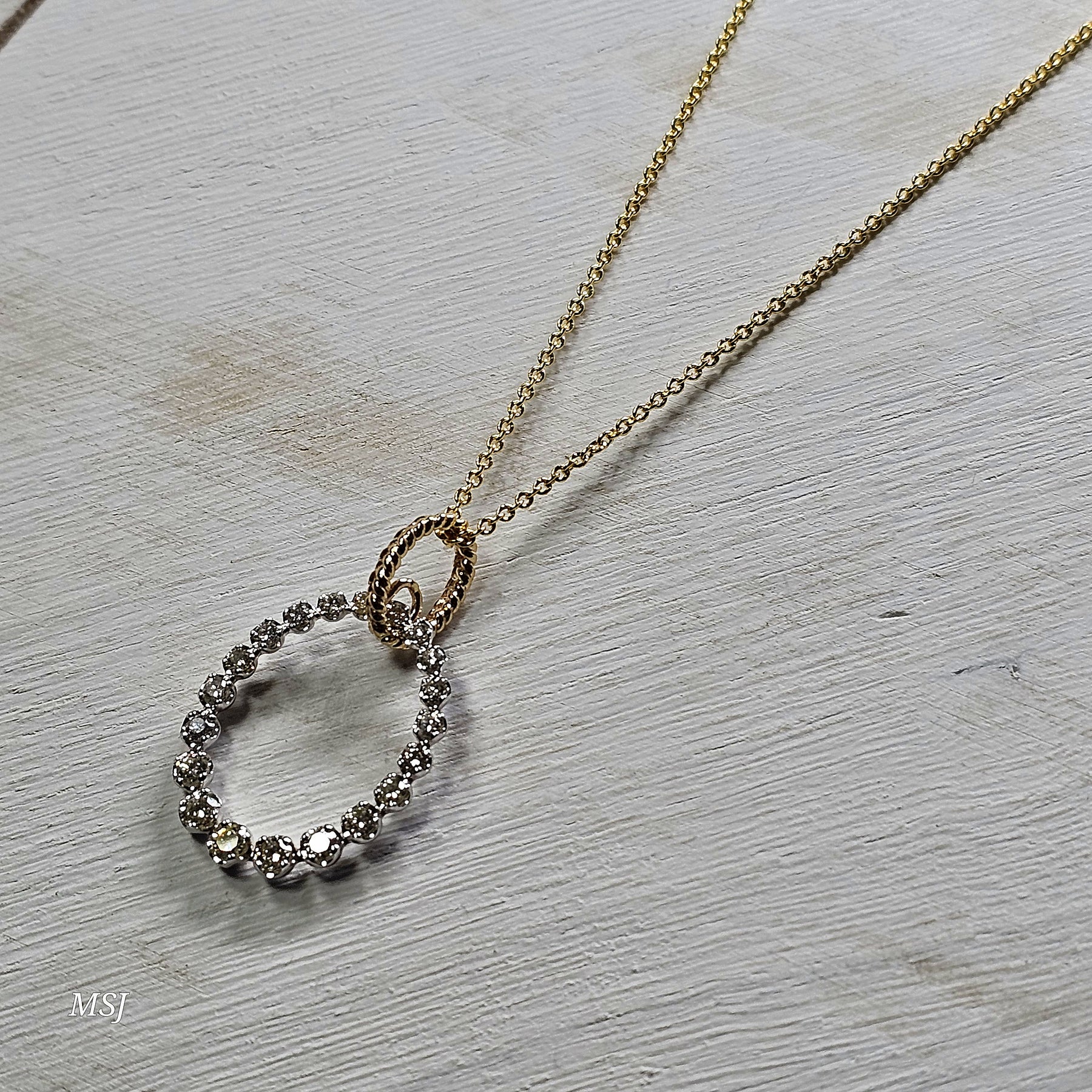 This stunning two-tone 14k gold pendant features an elegant oval design with graduating round diamonds prong-set for brilliant sparkle. A beautifully detailed yellow gold bail adds contrast and charm, paired with a matching 14k yellow gold cable chain secured by a lobster clasp. A bold, eye-catching piece with timeless style.