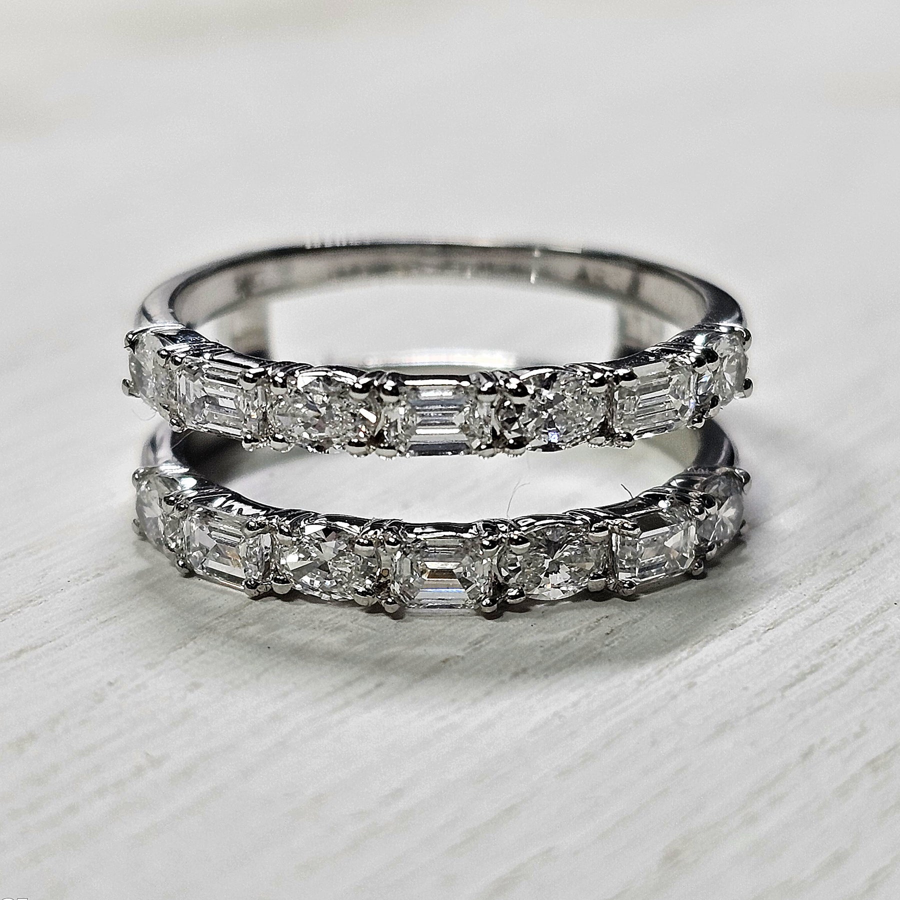 This large wedding band enhancer / guard is crafted in 14k white gold and designed to add bold brilliance to your engagement ring or wedding band. Featuring a striking mix of round and baguette lab-grown diamonds totaling 1.38ct, the design offers exceptional sparkle and elegant dimension.