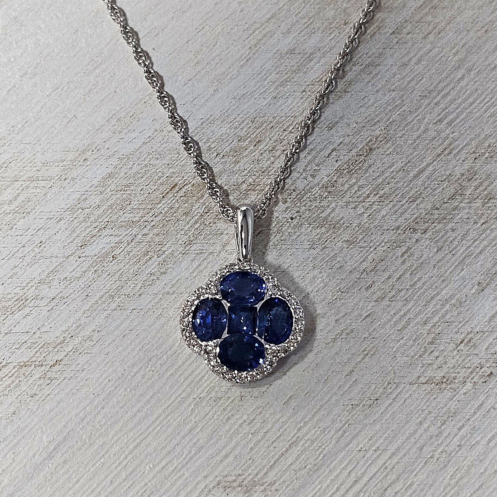 Celebrate timeless elegance with this unique 14k white gold clover-shaped pendant featuring 1.72cts of stunning blue sapphires. Accentuated by 0.15cts of round brilliant cut diamonds, this exquisite piece comes with a matching 14k white gold chain, perfect for adding a touch of sophistication to any outfit.