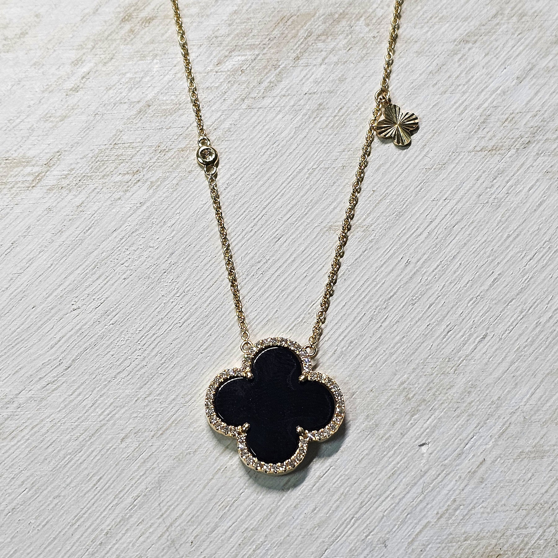 This popular, fashion-forward clover pendant features rich black onyx framed by a sparkling halo of round brilliant cut diamonds in 14K yellow gold. The striking contrast between the deep onyx and brilliant diamonds creates a bold yet timeless look. Suspended from a classic 14K yellow gold cable chain with a secure lobster clasp, this diamond halo clover necklace is perfect for layering or wearing as a chic everyday statement piece.