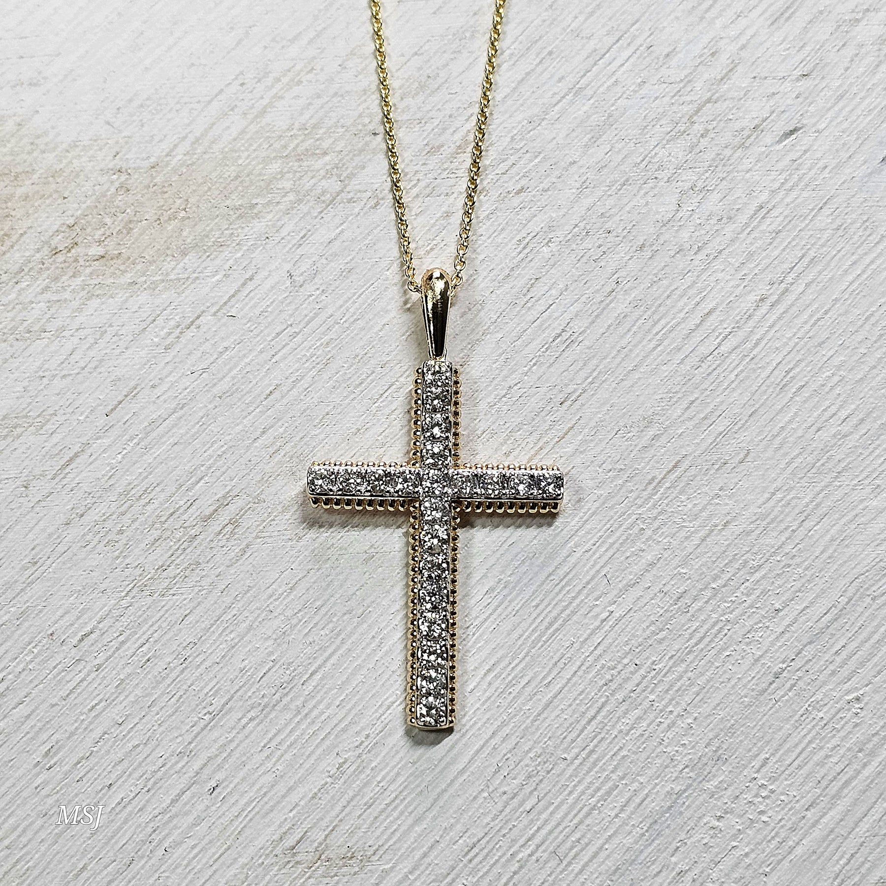 This classic 14k yellow gold diamond cross pendant features vintage-inspired milgrain beading for added charm and detail. Elegant and timeless, it’s paired with a matching 14k yellow gold cable chain, creating a meaningful piece perfect for everyday wear or gifting.