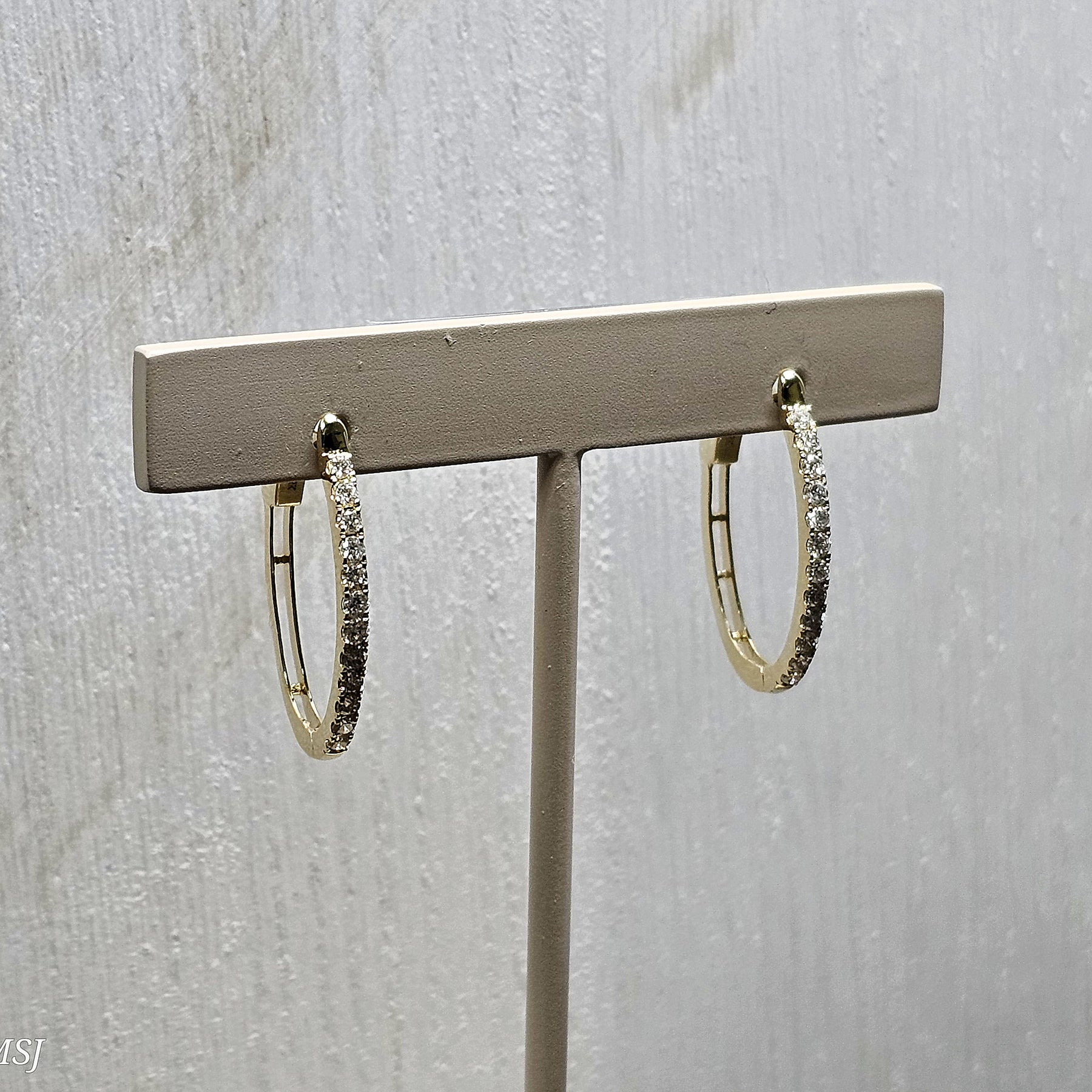 These traditional oval diamond hoop earrings are beautifully crafted in rich 14k yellow gold and designed for timeless, everyday elegance. Each hoop is adorned with round brilliant-cut diamonds, expertly prong set to maximize sparkle and light reflection. With a total diamond weight of .50 carat, these earrings offer the perfect balance of brilliance and classic sophistication.