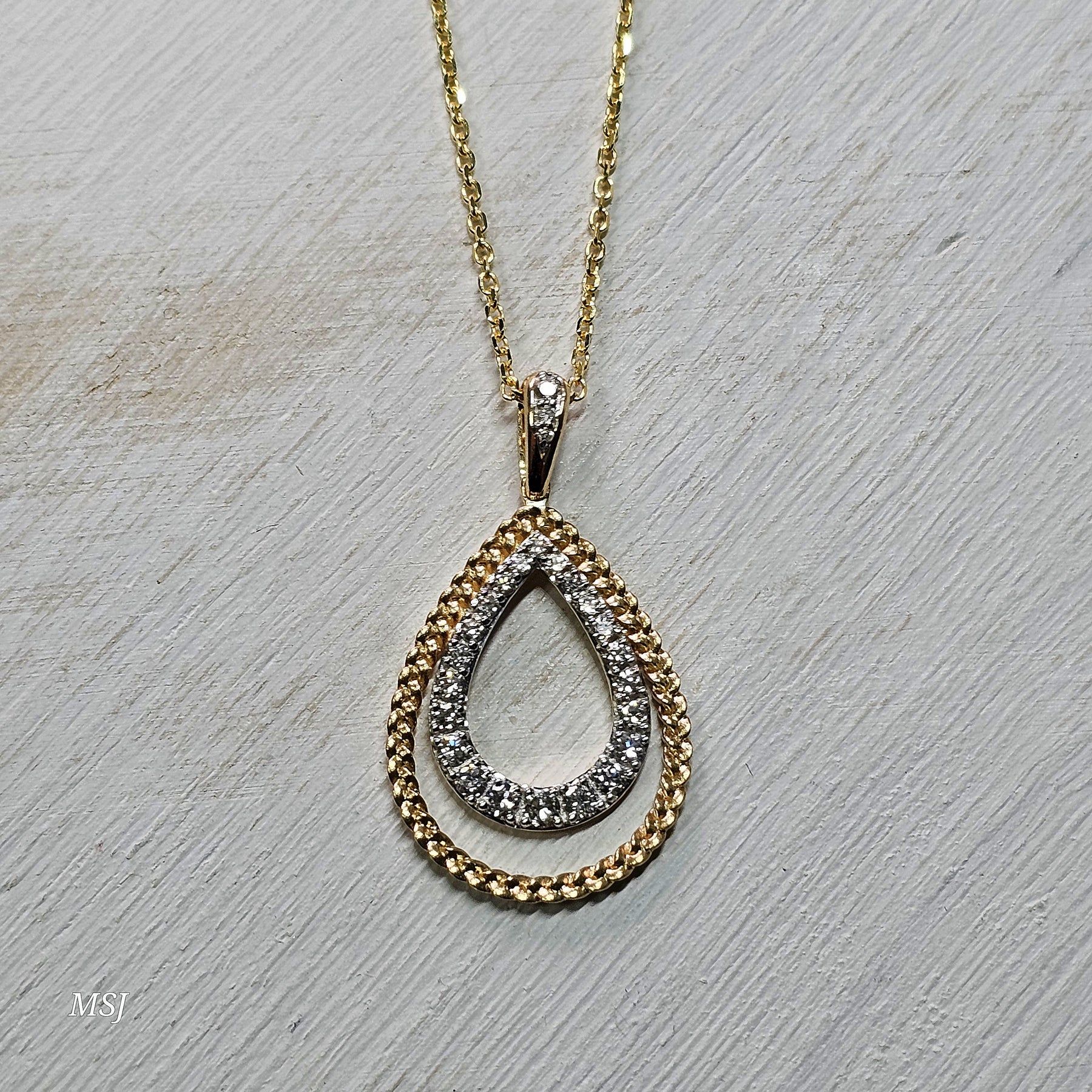This 14k yellow gold double pear pendant features .50ct of round diamonds set in the inner pear, creating brilliant sparkle at the center. A beaded yellow gold outer pear adds texture and elegance, all suspended from a matching 14k yellow gold cable chain. A unique, stylish design with timeless appeal.