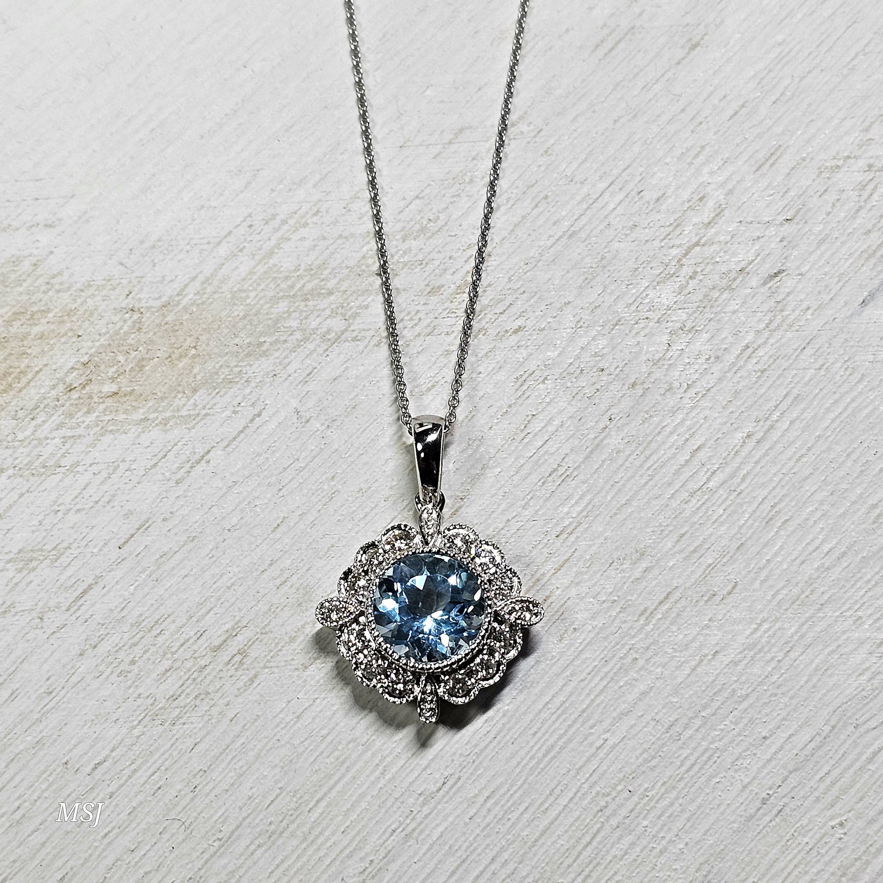 This unique vintage-inspired sky blue topaz and diamond pendant is crafted in rich 14k white gold and designed to make a distinctive statement. The centerpiece features a vibrant 1.88ct round blue topaz. celebrated for its bright, blue hue and lively brilliance. Surrounding accents of round diamonds totaling .25ct add radiant sparkle, enhancing the pendant’s antique-inspired charm.