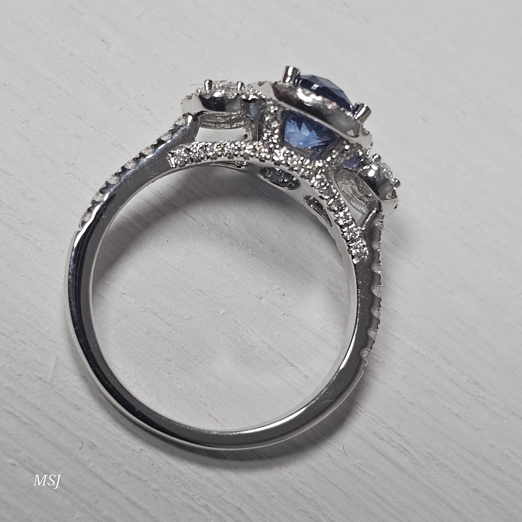 This stunning platinum ring showcases a GIA-certified 1.97-carat oval blue sapphire, radiating rich, vivid color. Two sparkling oval diamonds, totaling 0.22 carats, elegantly flank the center stone, while 94 round brilliant diamonds, totaling 0.49 carats, add a dazzling halo and band accent. Expertly crafted, this sapphire and diamond ring offers timeless elegance and exceptional quality.