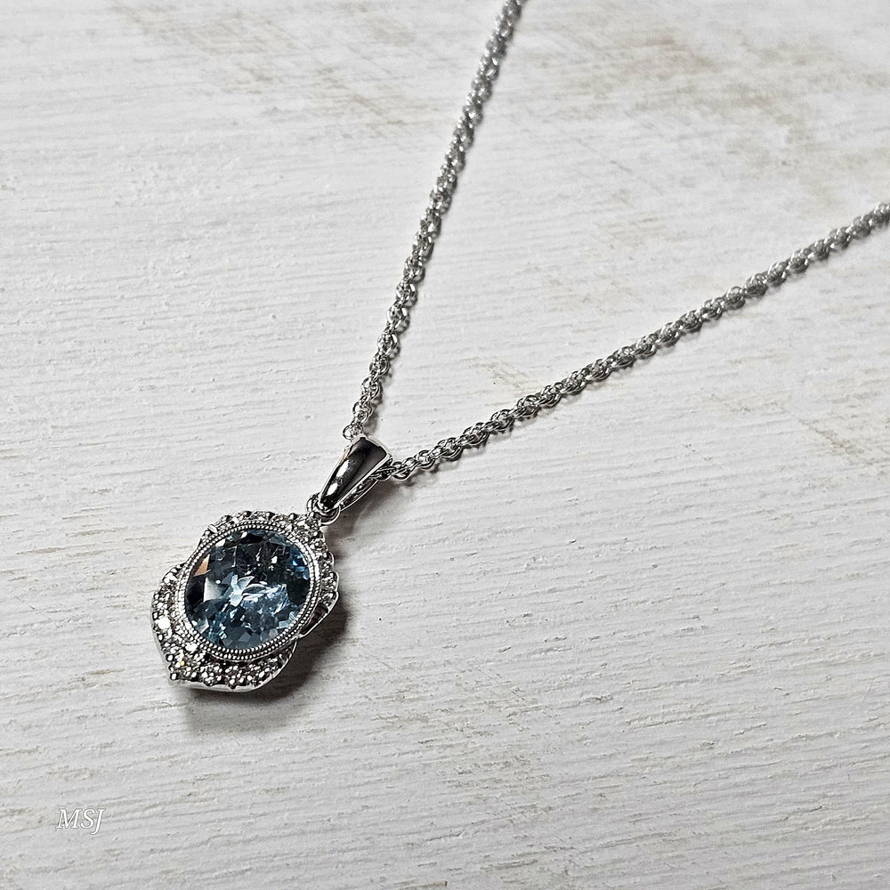 14k White Gold .83ct Aquamarine and Diamond Halo Pendant