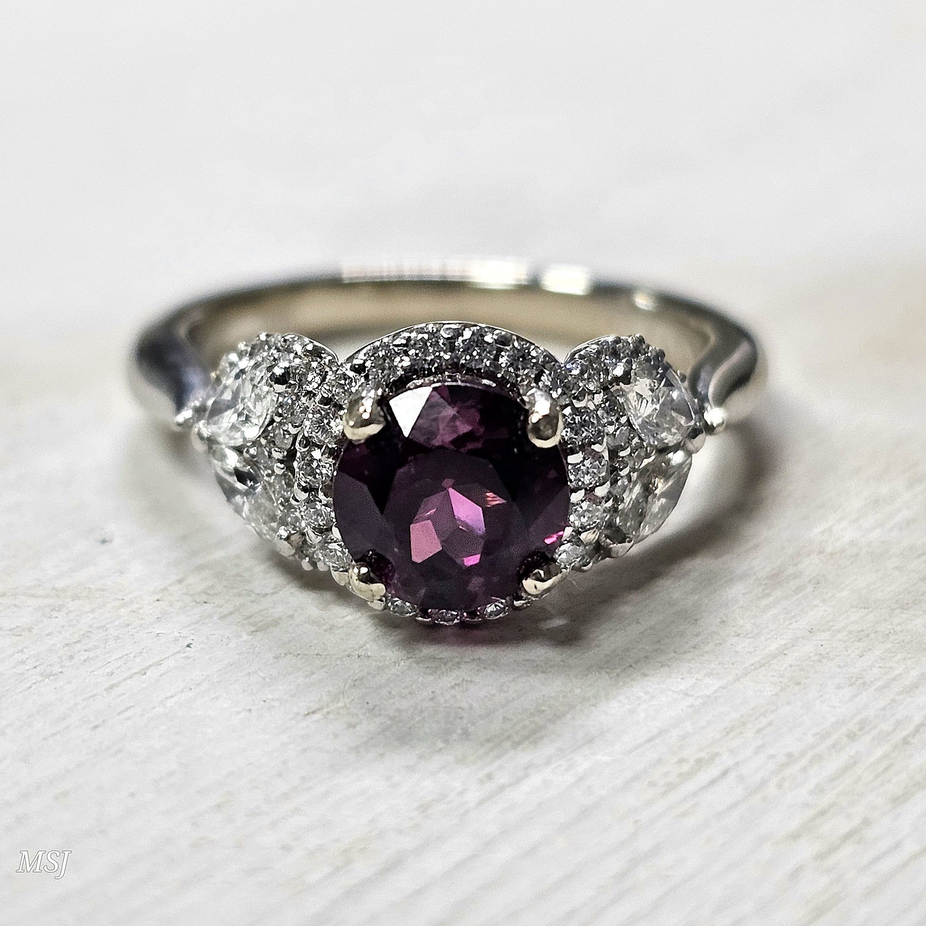 This Scott Kay Design 14k white gold ring features a rich 6.5mm rhodolite garnet as the centerpiece, framed in a shimmering halo of .62 carats of round brilliant cut diamonds. The intricate halo design enhances the deep wine-red hue of the garnet, creating a sophisticated and timeless look. Perfect as a statement ring or a meaningful gift, this designer mounting blends elegance, craftsmanship, and lasting beauty.