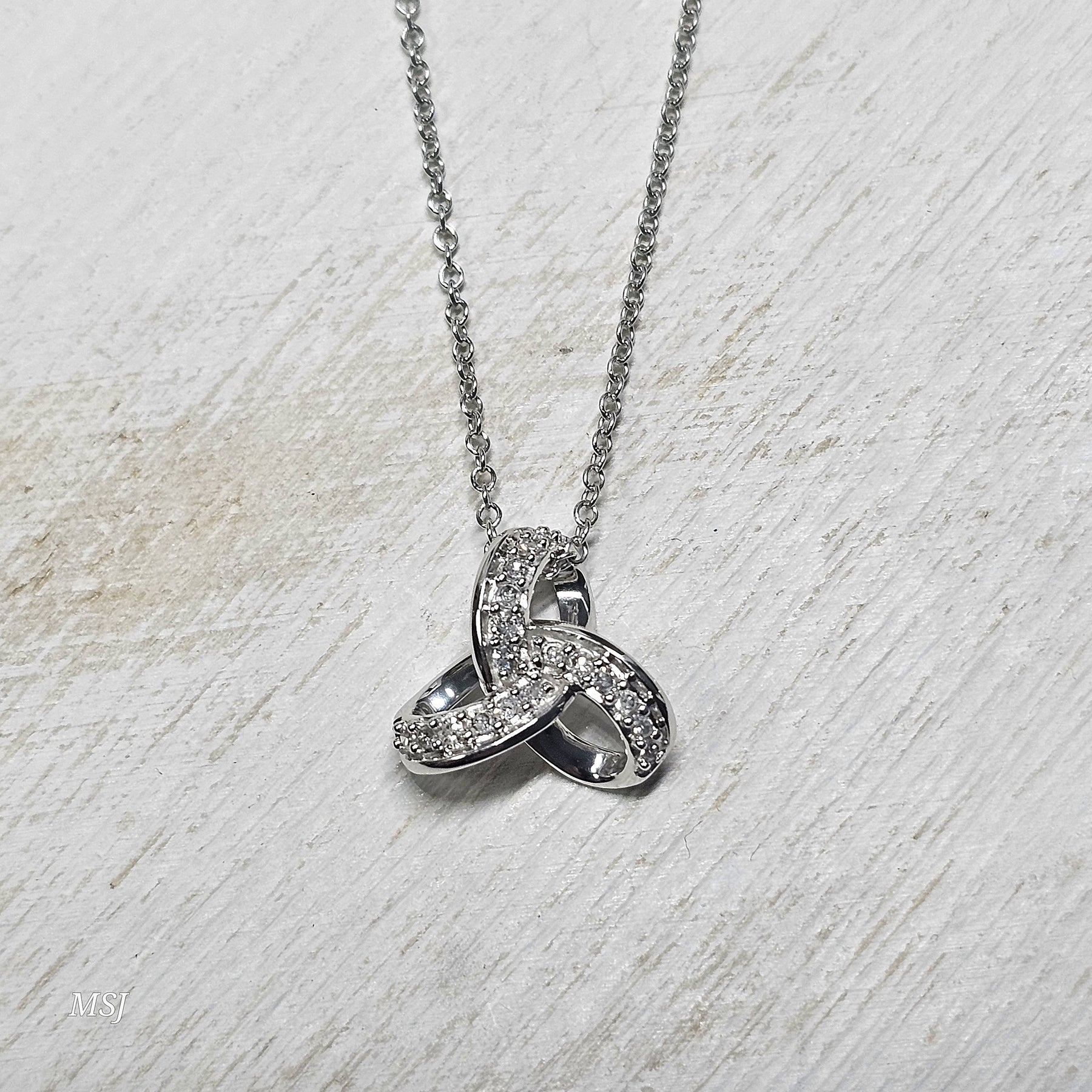 This elegant 10k white gold diamond pendant features a classic love knot design, symbolizing unity and everlasting connection. Sparkling round diamonds add just the right amount of shimmer, while the pendant is paired with a matching 10k white gold braided chain that is adjustable for the perfect length. Lightweight and comfortable, this piece is ideal for everyday wear or meaningful gifting. A timeless diamond pendant with a refined finish that complements any neckline and jewelry collection.