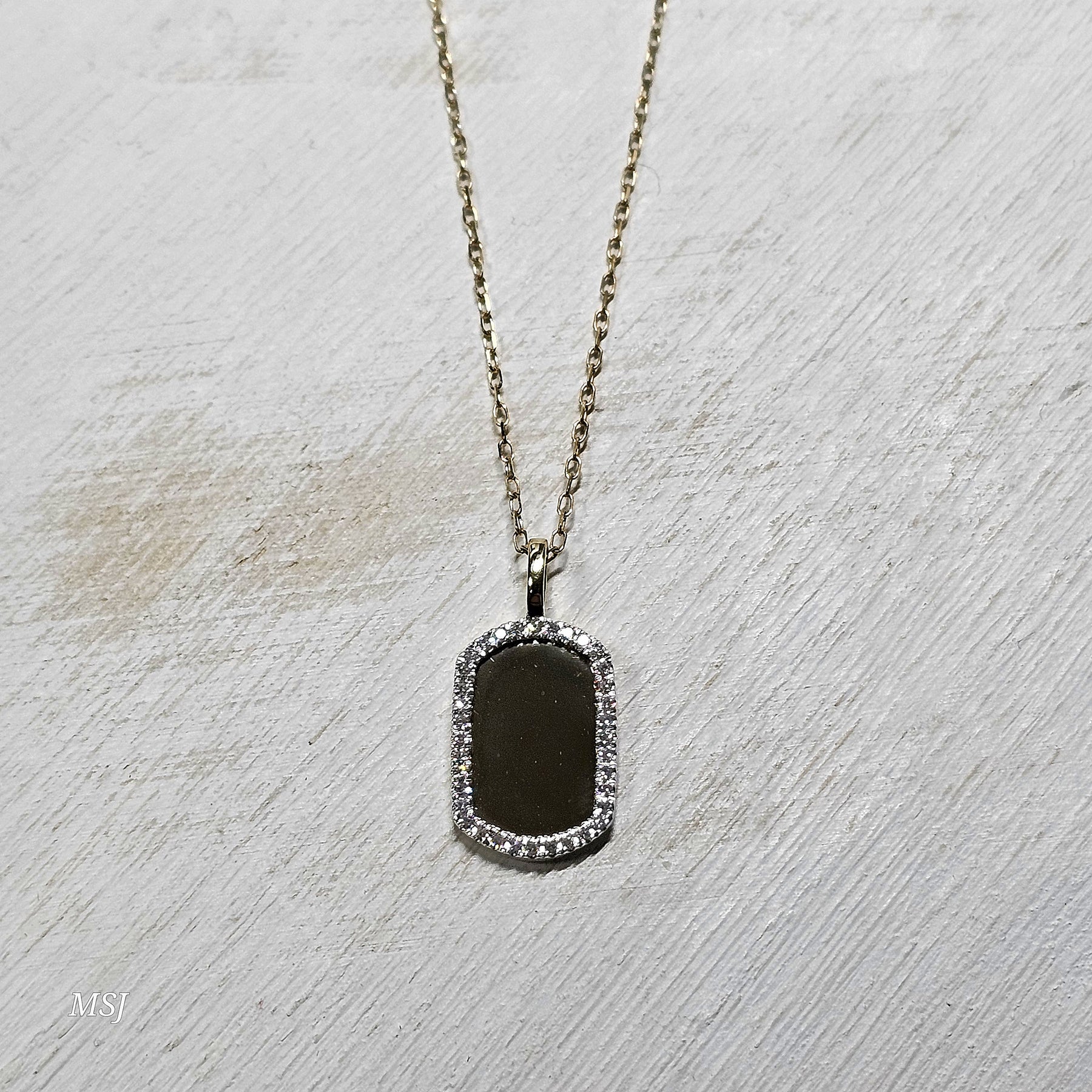 This petite 14k yellow gold dog tag pendant features a sleek engravable surface accented by a bezel-set diamond totaling 0.10 ctw. Modern and meaningful, this elegant design is perfect for personalization and everyday wear, adding a touch of sparkle to a timeless style. A beautiful gift or keepsake piece.