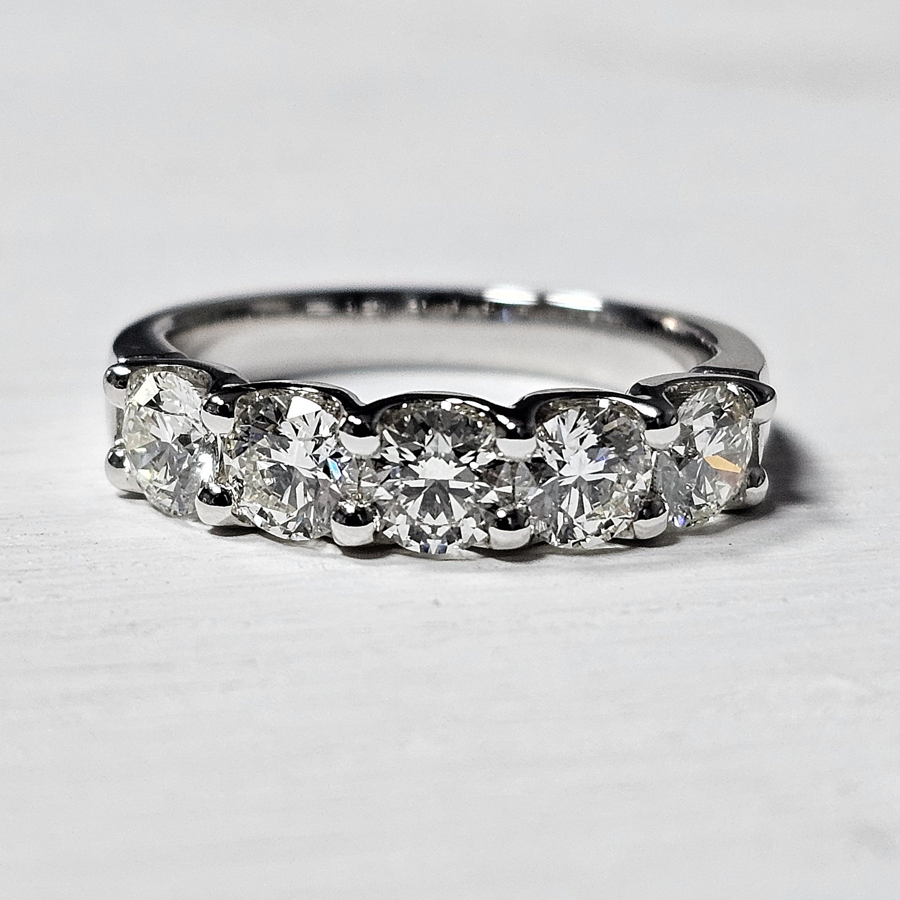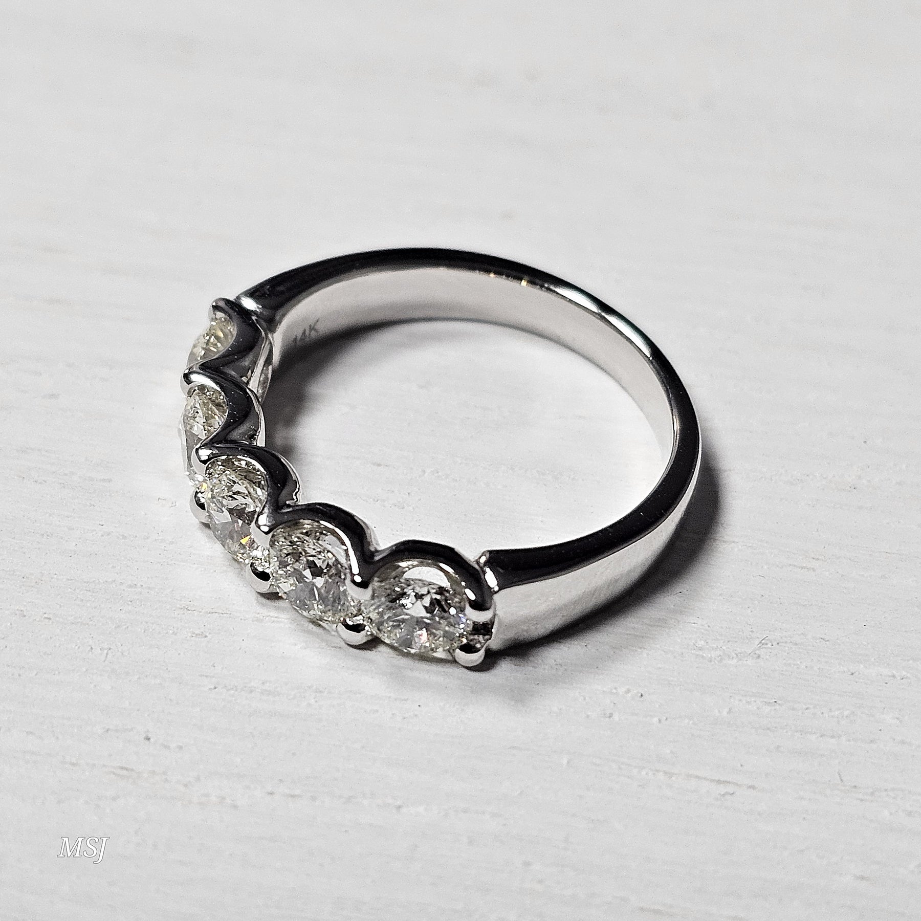 Crafted in 14k white gold, this stunning diamond band showcases 5 round brilliant cut diamonds totaling 1.50 ctw. Each diamond is graded SI1 clarity and H color, secured in a shared prong setting that maximizes sparkle and brilliance. With its bold prong-set design, this wedding or anniversary band makes a timeless statement of love and elegance.”