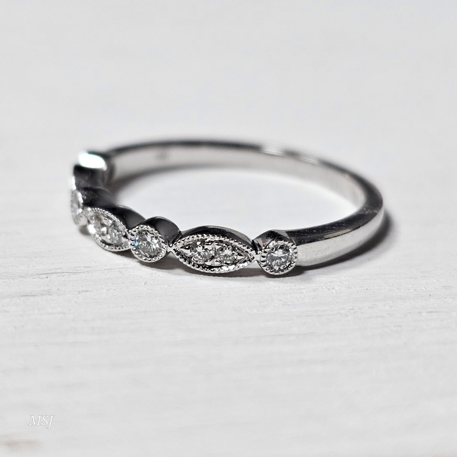 This elegant 14k white gold diamond band features .17 ctw of round brilliant cut natural diamonds, hand set with precision. The diamonds are graded SI1 clarity and H color, offering a beautiful balance of sparkle and quality. Designed with vintage-inspired beaded edges, this timeless band makes a perfect wedding ring, stacking band, or anniversary gift.