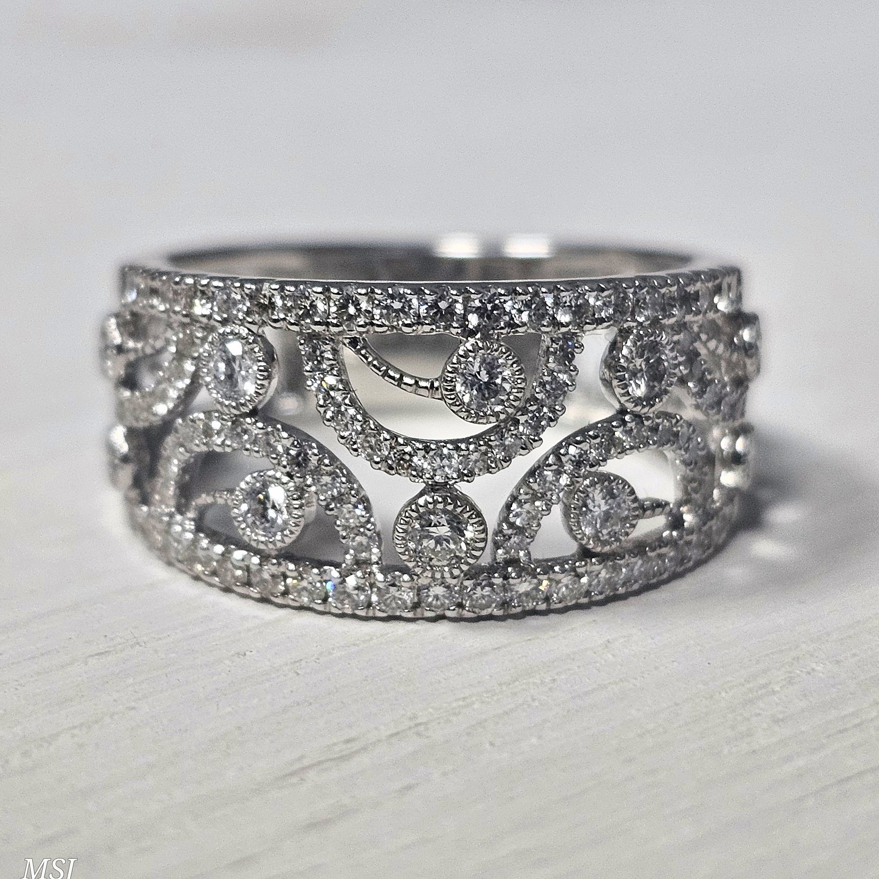 Elevate your jewelry collection with this exquisite 14k White Gold Diamond Decorative Band, designed with a distinctive paisley-inspired pattern that exudes timeless sophistication. Crafted in lustrous white gold, this wide cigar-style band features a beautifully tapered fit for both comfort and elegance. Adorned with 101 round brilliant cut diamonds, totaling 0.80 carats, the band radiates brilliance from every angle. The diamonds boast SI1 clarity and GH color, offering exceptional sparkle and fire. Perfect as a bold statement ring, an anniversary band, or a unique right-hand ring, this piece blends intricate artistry with modern luxury. Whether worn daily or reserved for special occasions, this decorative diamond band is a striking symbol of refined taste and enduring style.