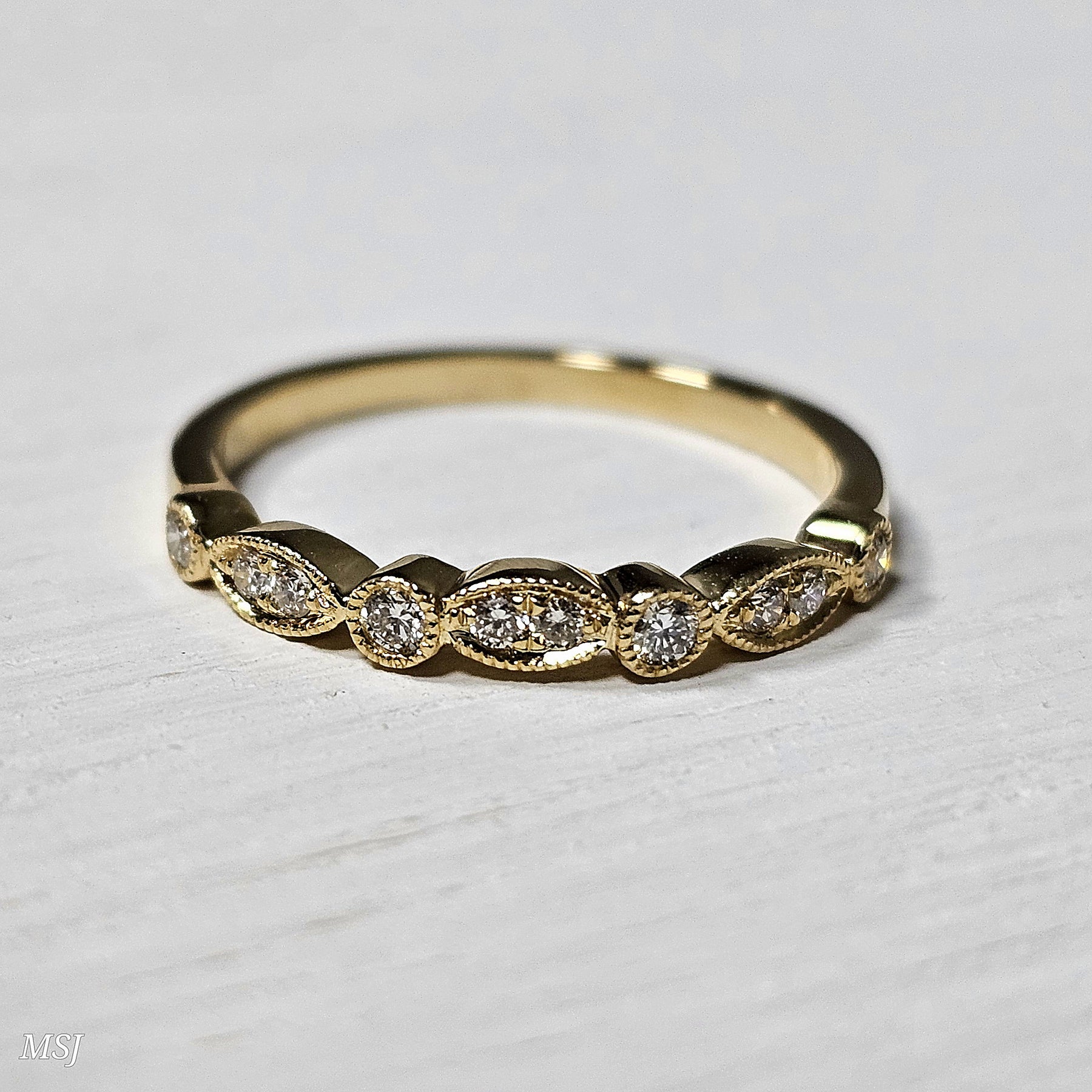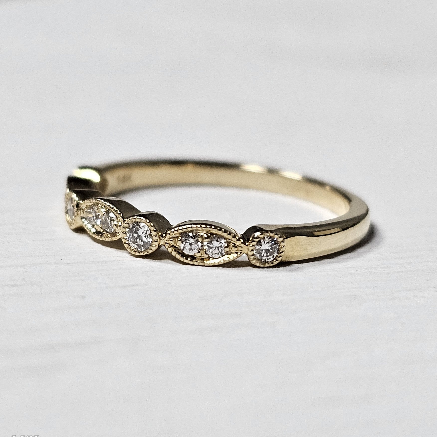 This elegant 14k yellow gold diamond band features .17 ctw of round brilliant cut natural diamonds, hand set with precision. The diamonds are graded SI1 clarity and H color, offering a beautiful balance of sparkle and quality. Designed with vintage-inspired beaded edges, this timeless band makes a perfect wedding ring, stacking band, or anniversary gift.