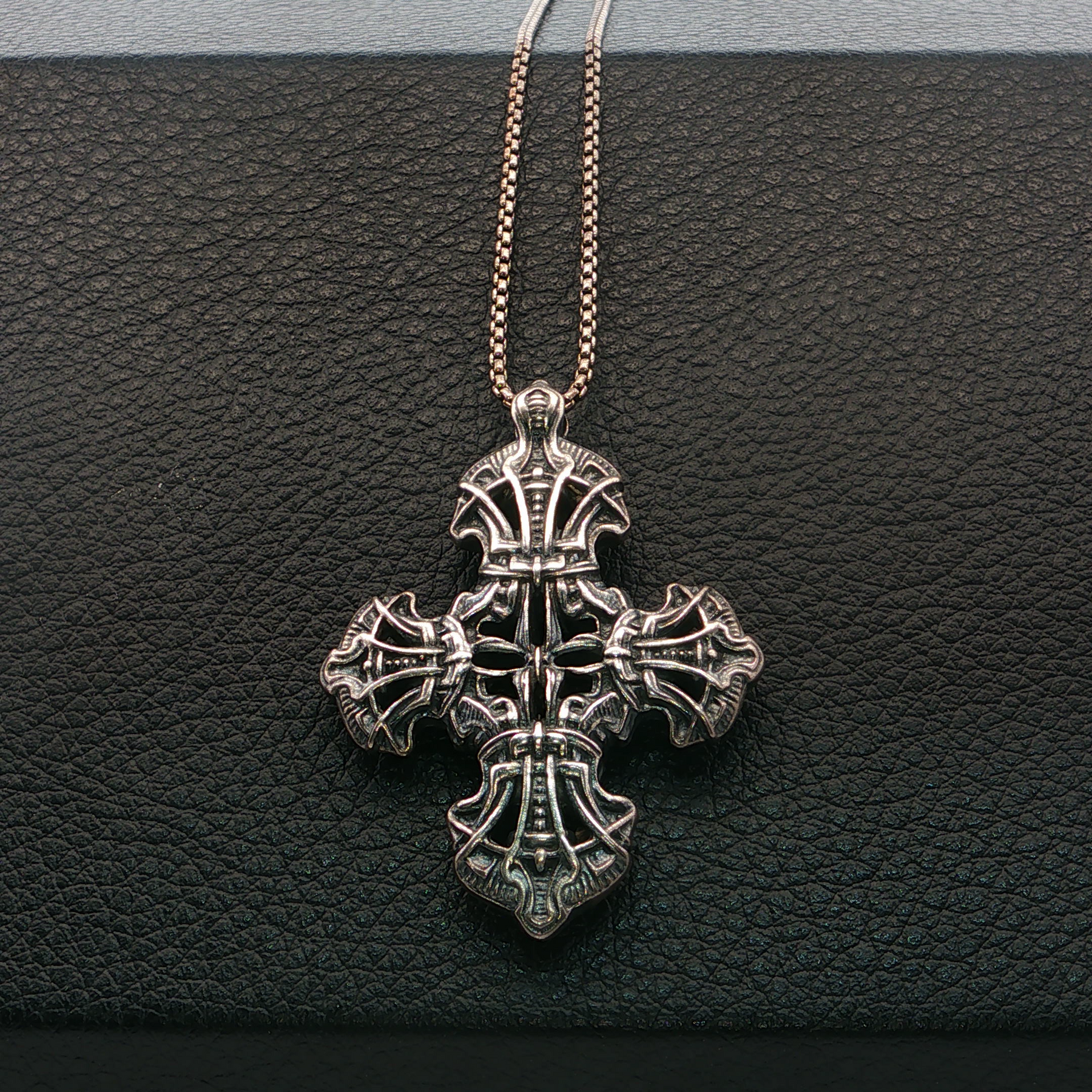 The Pax is a beautifully sculpted cross infused with pattern and texture inspired by medieval armor. This smaller necklace wears perfectly on its own, or it can be layered with other pieces on the neck to make whatever statement fits your style. Crafted from solid sterling silver, Pax is presented on a lovely rounded box chain at 1.8mm diameter with a lobster clasp closure, and both chain and clasp are also in sterling silver to create a timeless piece to serve for a lifetime.