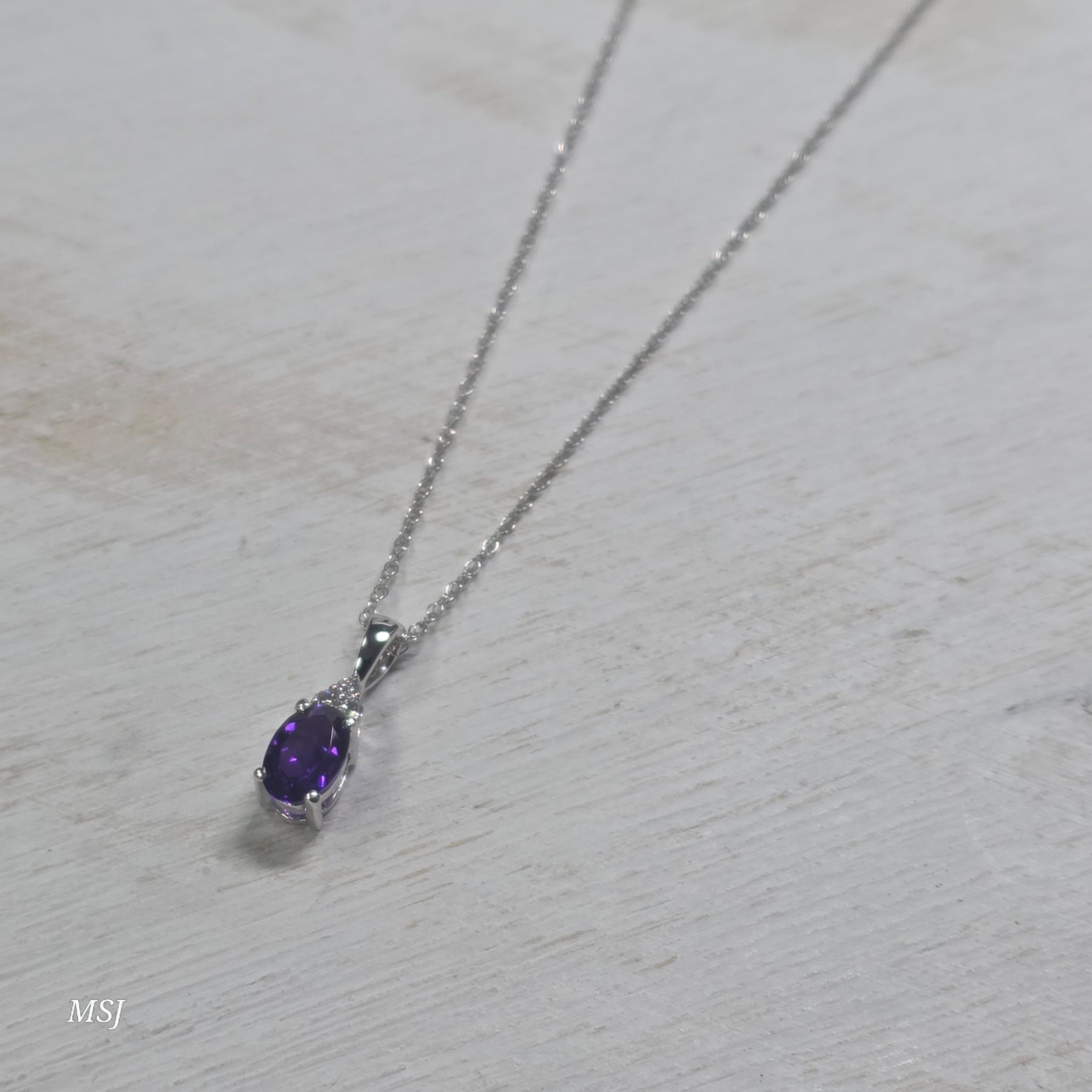 This 10k white gold pendant features a rich .50ct oval amethyst gemstone with vibrant purple color. The center stone is accented by .03cts of round diamonds, adding a delicate sparkle that enhances its beauty. The pendant comes with a matching braided necklace, offering a comfortable and refined finish. Perfect for February birthdays or anyone who loves colorful gemstone jewelry, this amethyst and diamond pendant brings elegant style to both everyday wear and special occasions.