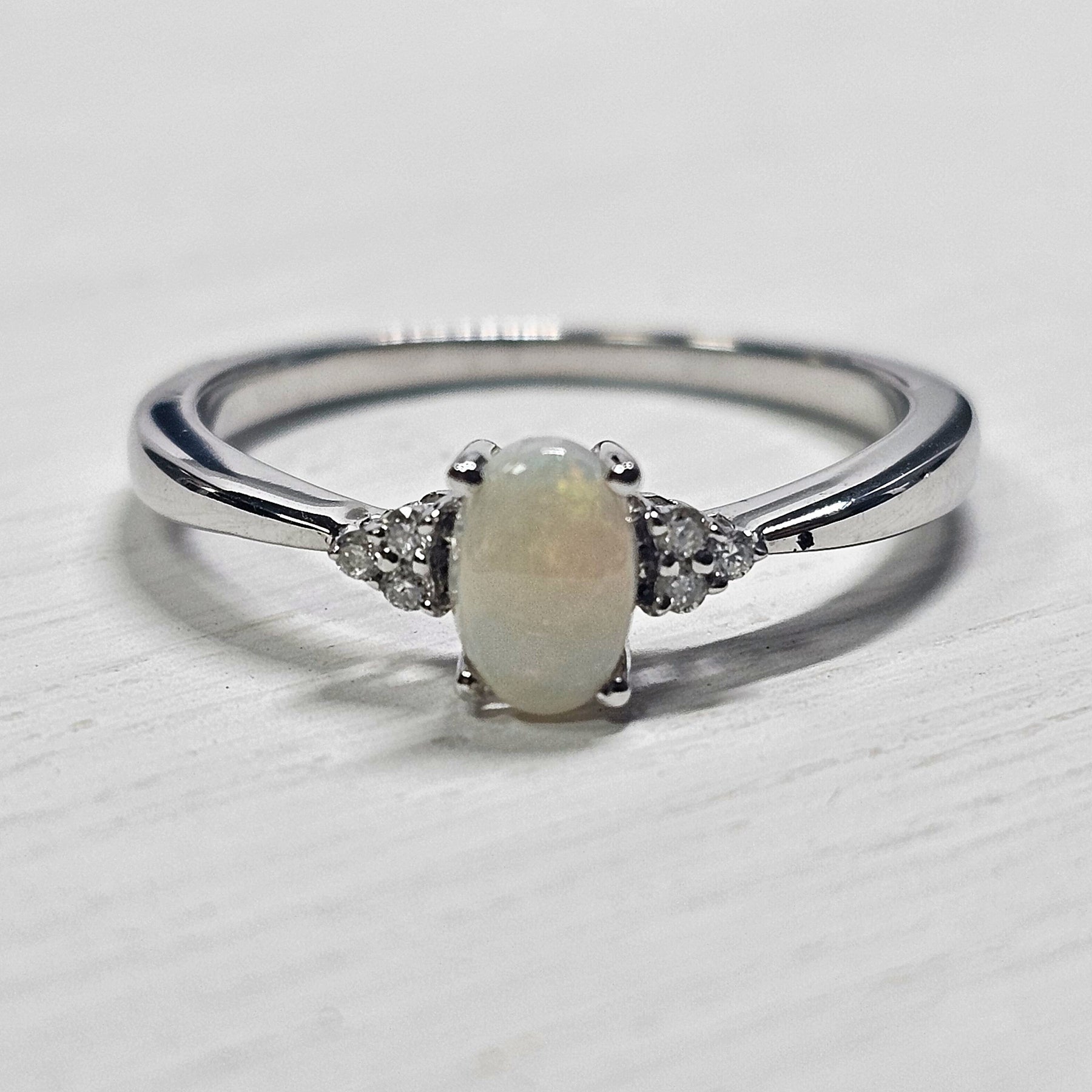 This petite 10k white gold ring showcases a vibrant oval opal that glows with flashes of color and natural fire. The center gemstone is accented by round brilliant diamonds totaling .55cts, adding sparkle and contrast to the soft opal hues. Its slim and elegant design makes it perfect for daily wear, stacking, or gifting. A beautiful choice for opal lovers, October birthdays, or anyone who appreciates delicate, eye-catching jewelry. Classic, feminine, and timeless, this opal and diamond ring is a stunning addition to any collection.